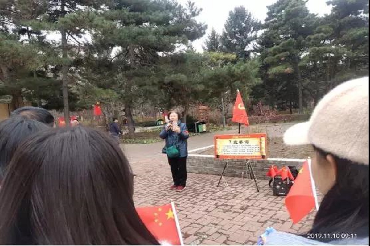 2019年11月10日,早上6.50志愿者们忍着困意来到了南湖公园,志愿者们进入南湖公园就发现了许多上了年纪的老人在宣传毛主席思想的爱国情怀,老人们很是热心,为志愿者们讲解了许多关于毛主席对祖国做出的贡献,志愿者们感受到了老人们强烈的爱国情怀并且深深的感染着每一名志愿者。