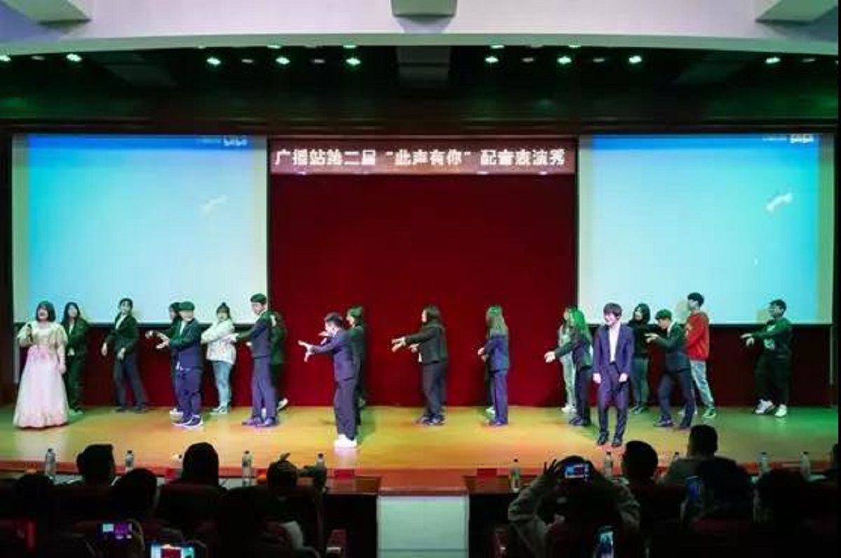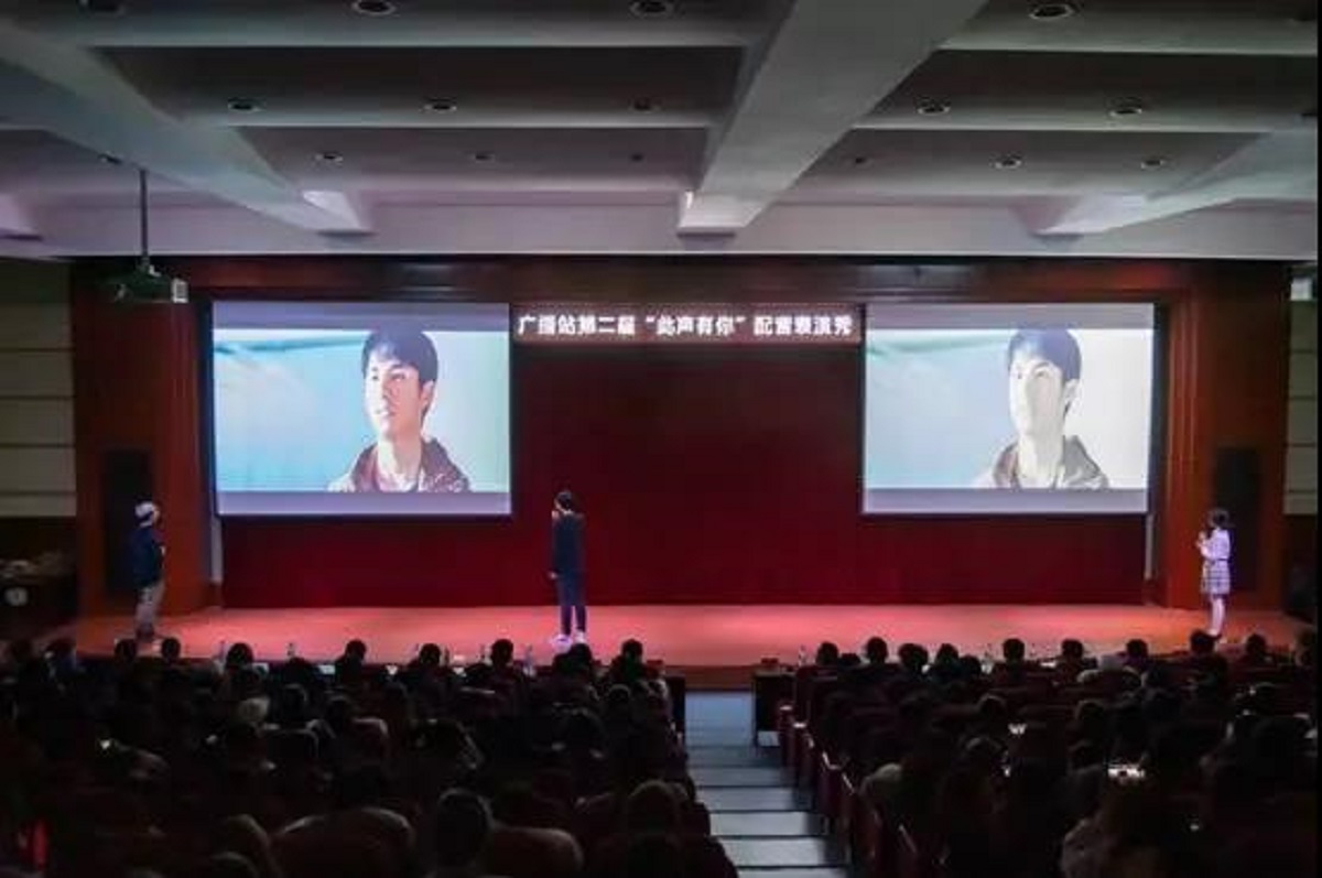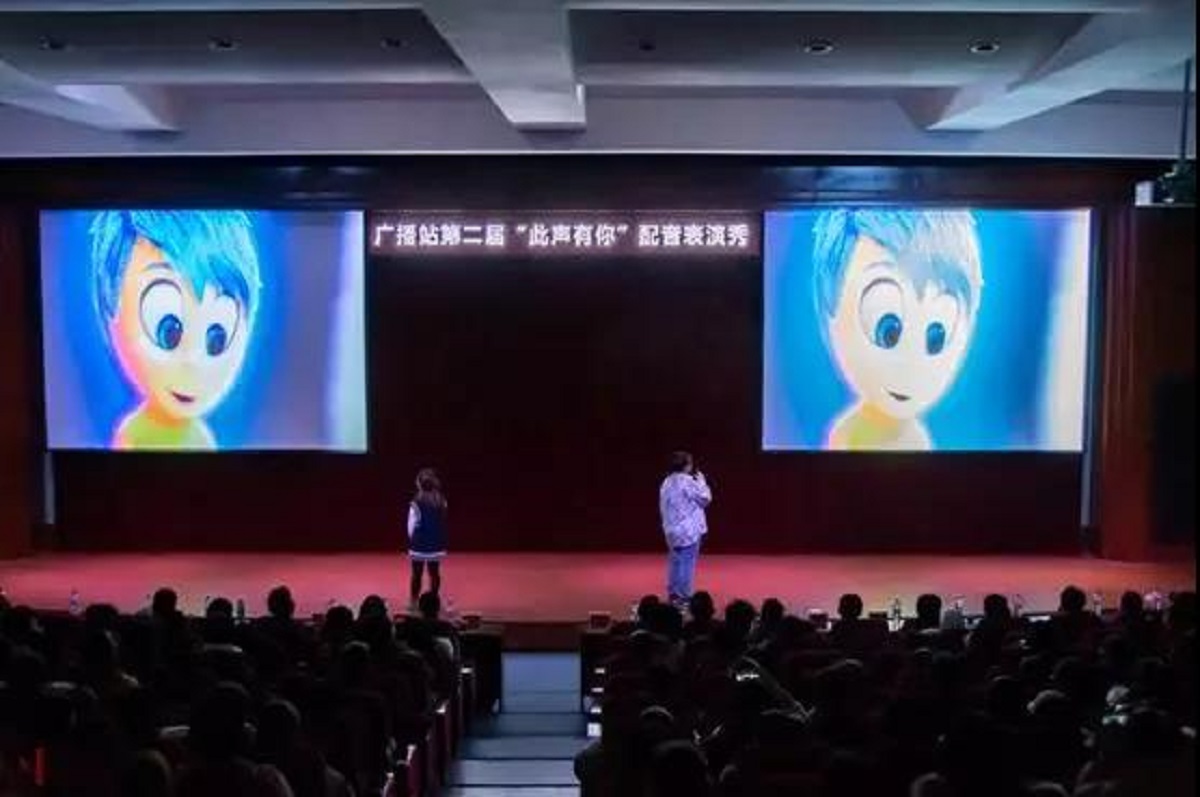 表演开始前,一段精彩的暖场视频让整个现场火热了起来,由广播站出品的英雄联盟配音片段,顿时惊艳四方。由主持人王赫、朱雅楠宣布表演开始,此次活动分为“以声传情,逐梦青春”与“峥嵘岁月,奋力前行”两大板块。随后,演员们配音了所属的影视桥段和动画片段,为观众们带来了一场又一场的视听盛宴。今年最火的教育题材影片《小欢喜》,曾滋润多少童年的美好童话故事《灰姑娘》,同样是今年热门话题原生家庭的《都挺好》,还有小时候最爱看的古装轻喜剧《武林外传》,展现男儿热血的《亮剑》等优秀作品一一呈现在观众面前。影片配音的过程中,台下观众都保持着安静,在观看投影画面和聆听演员们的配音中,大家感受到影片的魅力之处,仿佛融入到了精彩的故事情节当中,发出一阵阵喝彩。