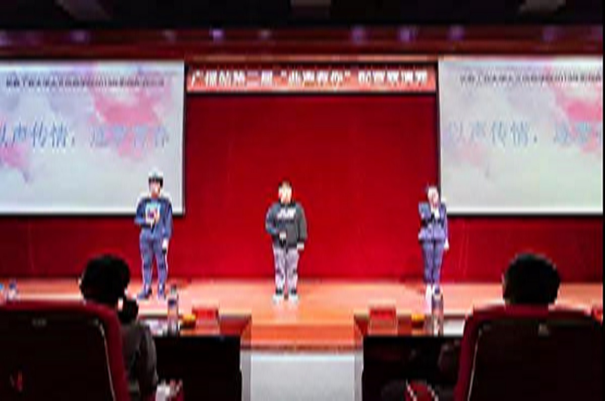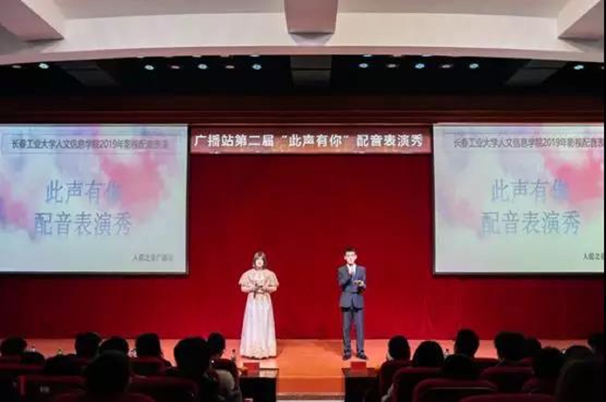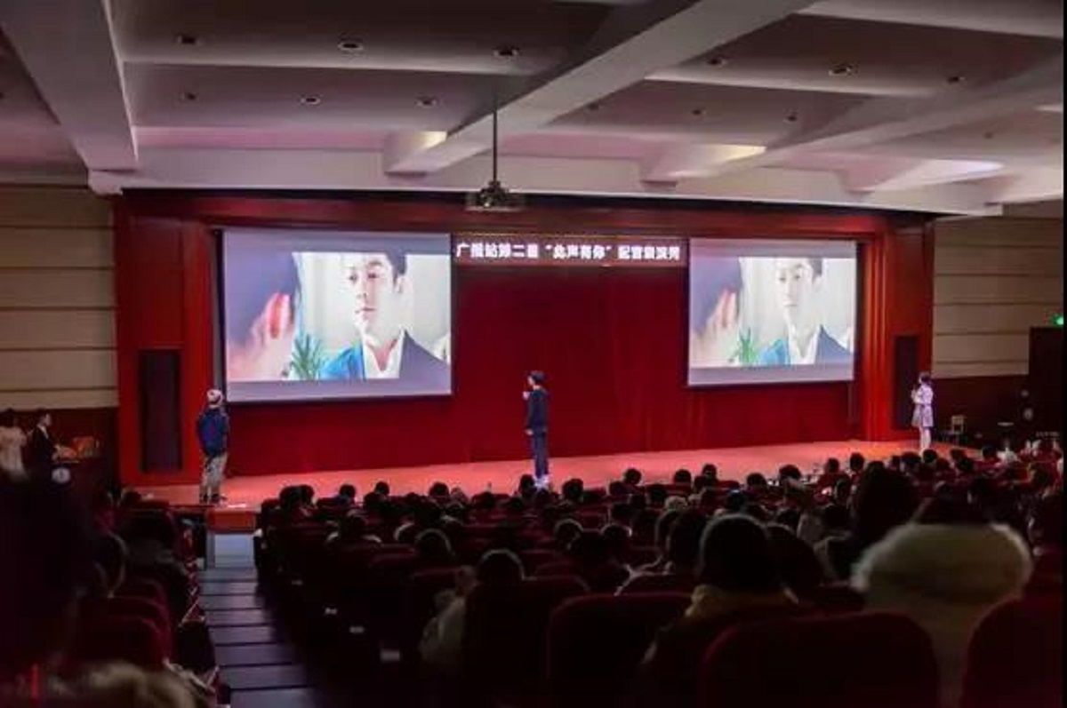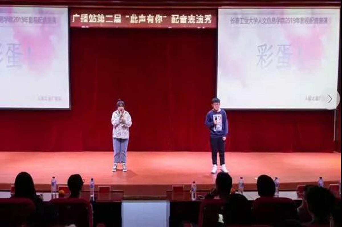 表演开始前,一段精彩的暖场视频让整个现场火热了起来,由广播站出品的英雄联盟配音片段,顿时惊艳四方。由主持人王赫、朱雅楠宣布表演开始,此次活动分为“以声传情,逐梦青春”与“峥嵘岁月,奋力前行”两大板块。随后,演员们配音了所属的影视桥段和动画片段,为观众们带来了一场又一场的视听盛宴。今年最火的教育题材影片《小欢喜》,曾滋润多少童年的美好童话故事《灰姑娘》,同样是今年热门话题原生家庭的《都挺好》,还有小时候最爱看的古装轻喜剧《武林外传》,展现男儿热血的《亮剑》等优秀作品一一呈现在观众面前。影片配音的过程中,台下观众都保持着安静,在观看投影画面和聆听演员们的配音中,大家感受到影片的魅力之处,仿佛融入到了精彩的故事情节当中,发出一阵阵喝彩。